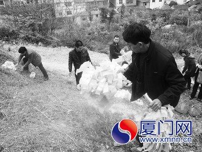 農(nóng)歷三月初三那天,他們掃墓的方式和清明掃墓是一樣的:先是由后人“掛紙”(在墳?zāi)股蠏旒埐蟾臑閴杭埐?作為上墳的標(biāo)志。掛紙之前,先鏟除墓上叢生的雜草,再將紙帛兩三張一疊折成波紋狀,再用小石塊壓在墳上。如果說墳?zāi)故亲嫦人篮缶幼〉膱鏊敲磯杭埦拖笳髦訉O們一年一度為祖先的居所增添新瓦。掛完紙,再準(zhǔn)備簡單的供品祭墓,然后燒紙錢,兒孫們在祖先墓前跪拜行禮,這樣既盡了子孫孝道,也祈求祖先護(hù)佑子孫平安如意。