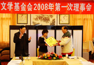 1月22日,在中華文學基金會2008年度第一次理事會上,中國作家協會主席鐵凝經全體理事推舉,受聘擔任中華文學基金會會長。中華文學基金會的老領導、中國作家協會名譽副主席張鍥向鐵凝頒發了會長聘書。鐵凝表示,感謝基金會理事們的信任,作為一名作家,不僅在1993年榮獲莊重文文學獎,更親眼目睹了中華文學基金會二十多年來服務作家、為繁榮我國文學事業所做出的貢獻。今后,愿與基金會全體同志一起努力,盡自己所能,為實現繁榮文學創作,培養文學人才,增進國內外學術交流,促進祖國文學事業的發展奉獻力量。理事會由中國作家協會黨組成員、副主席、書記處書記,中華文學基金會理事長高洪波主持,會上,理事們審議通過了基金會2007年工作總結和2008年工作計劃等九項議程。根據《基金會管理條例》和《中華文學基金會章程》,李小慧被推舉為中華文學基金會秘書長(專職)。中國作家協會名譽副主席鄧友梅等理事出席了理事會。