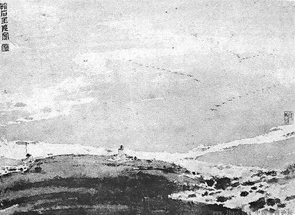 下面大家來看傅抱石的畫《平沙落雁》。平沙落雁是古箏曲,大家可能聽過,而傅抱石是近代的大畫家。各位看那個畫面,當然很蒼茫,是畫一個老者,背對著我們,他后面有一個小書童,幫他煮茶,他前面呢是一條小河,好像是黃河的上游,就這么從高原往下面的世界流過去。那么天上呢,右邊天空,三行,那個雁陣,那個人字型的,在飛,就是《平沙落雁》。這本來是古箏曲,后來變成傅抱石的畫,現在又變成我的詩。我就從他的畫面,從我聽過的古箏曲里面,得來的印象,演繹成這首詩,也就是所謂美感經驗的轉換轉化。《平沙落雁》這首詩我限定自己每一行不得超過八個字,短則六字!镀缴陈溲——觀傅抱石畫展》:“在大河起源的高原,一老者趺坐于沙丘,初融的雪水清淺,在他的腳底路過,向下面那世界奔流,膝頭的古琴只等,修長的指尖一落,神經質的弦上,就松開敏感的筋絡,放出一只、兩只、三只,接翅而起的寒禽,沖破高原的肅靜,直到空中的翼影,翩翩排成了雁陣,是河在流著呢還是,時間在下面流過?是沙在靜靜地聽著,是整片高原在應著,天蓋地載的寂寞?沙,也有耳朵么,一千里之內,除了,老者與煮茶的小廝,下風可還有一只,耳朵豎起來聽么?琴聲悠悠能傳到,昭君或李廣耳旁么,昭君有哭泣,李廣,有停下馬來聽么?絲路的駝商絡繹,有回過頭來找么?面向無窮的空曠,背著入神的觀場,老者無言,琴聲裊裊,在他的指間起落,尾聲轉緩更依依,呼應著雁陣的回旋,愈迥愈低愈低回,飛回老者的懷抱,曲終了么,沙漠問道,是雁陣收回了琴匣,究竟,還是,琴聲散落在天涯?”(鼓掌)