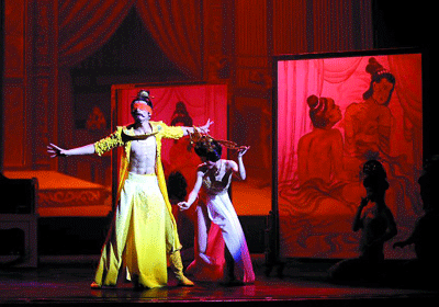 前日,有網友以《首都舞臺放寬尺度,唐明皇與楊貴妃上演床上戲》為標題,發了一組正在北京上演的動作音樂劇《大唐貴妃》的現場圖片。照片顯示,該音樂劇布景相當大膽,在表演唐明皇和楊貴妃的床戲場面時,一塊屏風搬上了舞臺,屏風上的圖案是“春宮圖”;而唐明皇和楊貴妃嬉戲時,更是穿著睡衣,周圍扮演宮女的演員上半身穿著肚兜,下半身僅著T-BACK和透明的蕾絲褲,無比清涼。