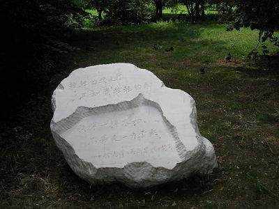 劍橋的一位中國朋友,江·西蒙將《再別康橋》的首行和末行刻在了石碑上,并將它帶到劍橋。石碑用的是北京的白色大理石(這與構筑北京紫禁城的大理石質地完全一樣),立在此地以作為連接中國與國王學院間紐帶的標志。陳肖秋 編譯