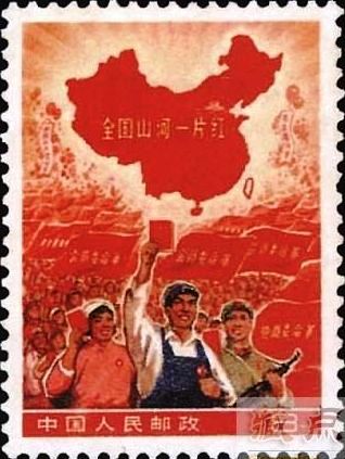 1968年9月“文化大革命”期間,全國除臺灣省外29個省、直轄市、自治區均成立了革命委員會。為紀念和慶祝這一事件,郵電部決定于1968年11月25日發行1枚“全國山河一片紅”郵票。面值8分。郵票圖案為工農兵手持《毛主席語錄》,背景中“革命委員會”的紅旗匯成的紅色海洋和工農兵群眾熱烈歡呼的場面,上方為一幅中華人民共和國地圖,地圖上除臺灣省外全部繪成大紅色,上面印有“全國山河一片紅”金字,郵票票幅為30毫米×40毫米,齒孔11.5度×11度,整張枚數50(10×5)。影寫版。北京郵票廠印制。集郵者稱為“一片紅”。