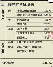 在06年被曝光的一份主持人走穴身價(jià)清單上,李詠以18萬的身價(jià)高居榜首。而后他代言某地板品牌的消息也引起爭議,節(jié)目組聲稱李詠只是跟老板合影,是品牌自己在炒作而已,堅(jiān)決否認(rèn)做了廣告,再加上名下價(jià)值百萬的保時(shí)捷跑車,李詠這個(gè)名字的含金量當(dāng)然讓人咋舌。在采訪中,與先前的韓喬生一樣,這些主持人都說自己沒什么錢,一個(gè)月也就一萬來塊,跟明星完全沒辦法比。話音剛落,李詠的名字又赫然出現(xiàn)在最有價(jià)值主持人排行榜榜首,可能是受金融危機(jī)影響,縮水1.1億,但總價(jià)也有3.89億。