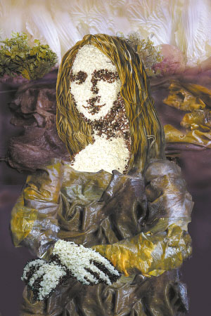 桔多淇1996年畢業于川美,學的是美術設計。這位家在謝家灣的重慶女孩兒,曾在黃桷坪當過“黃漂”,隨后,又成了“北漂”。讓她一夜成名的,是她最近在北京舉行的名為“蔬菜博物館”攝影個展,在這次展覽上,《最后的晚餐》的餐桌變成了一塊巨大的豆腐,尤大等一干人則是用生姜制成。而《蒙娜麗莎》更是豆腐當臉,海帶當頭發,紫菜做衣服,看上去很有意思。而這些攝影作品的素材,都是桔多淇親手制作。桔多淇在畫展上展出的都是以這些素材為元素的攝影作品,“每一件我只做了12張照片,小尺寸的畫廊定價為1880美元,大尺寸的要賣2888美元,在開展的第一天,賣出了兩幅小尺寸的。”
