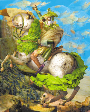 桔多淇在產生蔬菜作畫的想法后,就開始轉悠北京的菜市場。她去買菜,看到長相怪異的生姜,眼里就會大放異光,迅速下手,而走到賣豆腐的面前,也不說話,拿出相機就對著白花花的豆腐開拍。桔多淇說:“菜販以為是媒體搞衛生監督,嚇得不行,其實只是因為我做《最后的晚餐》的桌子需要很大一塊豆腐,我買回家也吃不完,于是就在菜市場拍了回家用電腦處理合成。”桔多淇說,她尋找原料的菜市場幾乎每一個菜攤她都“光顧”過,并且對菜市場邊角余料情有獨鐘,甚至還會四處“撿”菜。