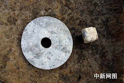 出土刻符大玉璧的玉架山遺址16號墓位于杭州市余杭經濟開發區,安置在墓主人左腰腹部;玉璧直徑為24.6厘米、厚約1.5厘米,屬透閃石-陽起石系列軟玉,厚重,圓大,精美。12月6日下午3點多,浙江省文物考古研究所與余杭博物館聯合考古隊總領隊丁品、具體主持玉架山遺址發掘工作的樓航等在清理16號墓時,發掘出土了大玉璧、玉蟬形飾、玉帶鉤、玉端飾和12件石鉞等器物;在這個殘長約2.3米、寬約1.3米的16號墓坑里,發掘人員還在大玉璧西側發現一件玉琮,這件玉琮高約5.4厘米,射徑約7.5厘米、孔徑約3厘米。