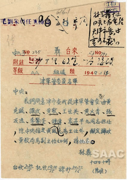 1.1949年1月14日,林(彪)、聶(榮臻)等關于天津軍管會人選問題的電報(第1頁)