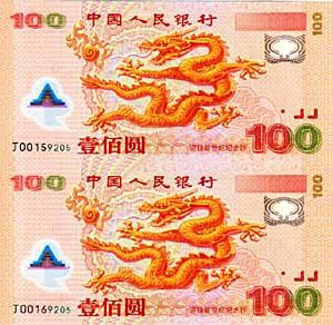 為了迎接新世紀的到來,中國人民銀行于2000年發行了迎接新世紀千禧年雙龍紀念鈔連體鈔,裝幀冊的發行量為10萬冊,面值為200元。