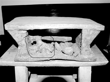 中空部分展現(xiàn)的是一間磨房的情景,有磕碓、碾子(均為剝谷碾米之用)、籮筐、小雞等物,有的固定,有的可動。趁勞動間隙,一對男女裸體在磨房的角落里緊緊擁抱。從身體形態(tài)和姿勢上,可看出他們正在歡愛。此外,工作人員還發(fā)現(xiàn)一具陶制的“且”長約10厘米,直徑約2.5厘米。