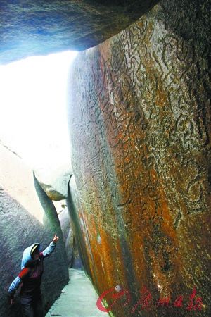 我們沿山路攀爬港灣旁邊的風猛鷹山,不久便到達其中最大一幅巖畫所在地:藏寶洞。從遠處看,這只是一堆巨大的花崗石巖體,若從空中俯視,可以發現它像一只碩大的海蚌,微微張開一條縫,而巖畫就刻在這花崗石崩裂兩瓣后的平整的巖面上(見主圖)。