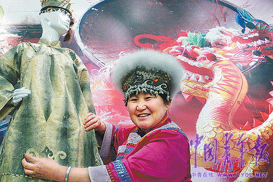 在今年2月北京舉辦的中國非物質(zhì)文化遺產(chǎn)傳統(tǒng)技藝大展上,這件魚皮衣服吸引了無數(shù)眼球。頭戴雪兔毛魚皮帽,腳穿魚皮靴子的尤文鳳,坐在展臺前,不厭其煩地回答著觀眾的問題。