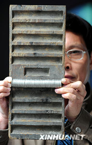 據介紹,這塊清代使用的“點鈔機”狀似算盤,長37厘米,寬16厘米,內刻有11條凹槽,直徑同當時流通的銅幣直徑吻合,其中10條長凹槽可一次性勘驗1000枚銅幣,中部的一條短凹槽可勘驗50枚銅幣。新華社記者彭張青攝