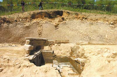 汪大猷墓位于余姚市大隱鎮下磨村后山。記者昨天趕到現場,老遠看到一座山,幾乎半個面都被開掘出來,相當壯觀。沿著泥沙路往上走,路慢慢地變窄。不一會,前方出現一條亂石鋪成的道路。參與此次考古發掘的考古隊隊員羅鵬告訴記者,這是墓前的神道,以前神道兩旁各有對稱的石羊、石馬、石虎和石人4對石像生。不過年代久遠,其中幾座遭到損壞,現尚有4座保存在村民家中。記者眼前只見磚頭搭起的基座。