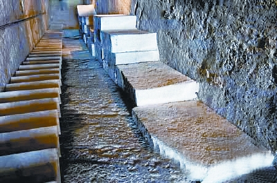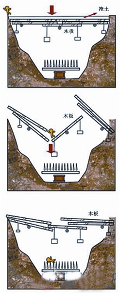 一切完畢后,施以偽裝,外人不知其詐。若有盜墓者進得門來,踏中蹺板條,外力作用迫使繃緊的索鏈某處掛鉤脫落,如同打井的轱轆突然放松,懸空的巨石疾速落下,將躲閃不及的盜墓者拍成肉餅。因蹺板呈細窄的長條狀,只有被踏后才能導致懸石落地,而相鄰的其他蹺板則安然無恙,仍靜靜地伏在原處等待下一伙盜墓者的進入。一旦盜賊的腳步踏上,與之相連的懸石相繼落下,再次對膽大妄為者給予致命一擊。如此往復,直至三層懸石盡墜于地,殺傷數人為止。