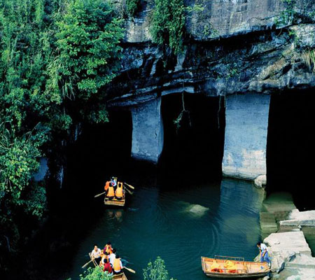 特別值得一提的是洞口處的通海橋,橋下一潭清澈見底的泉水嘩嘩作響,很可能存在活的水源。溯流而下,到了洞內(nèi)最低處,石壁清晰可見精雕細(xì)刻的花紋。雖然這里已經(jīng)位于新安江水面以下2米,上下落差有25米,但是洞內(nèi)通風(fēng)狀況良好,并無任何不適感覺。另外,洞窟的怪異構(gòu)造使得聲波被石壁吸收,無論多么大聲喧嘩,在洞內(nèi)都聽不到一絲回音。
