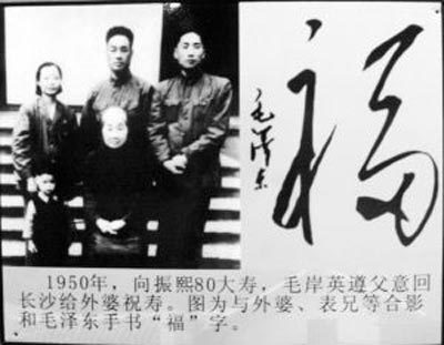 1950年,向振熙80大壽,毛岸英遵父意回長沙給外婆祝壽。圖為其與外婆、表兄等合影和毛澤東手書“福”字。