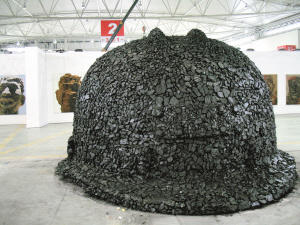 現場最扯眼球的作品是藝術家張建華的雕塑作品《礦工帽》。張建華說,這個礦工帽用了3噸煤塊貼滿,更像一座孤墳,他希望以此反映農民工在社會發展過程中付出的沉重代價。