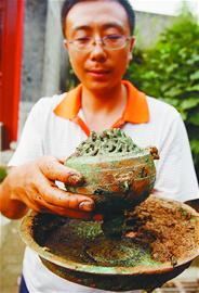 就在記者將要發稿時,考古工地又傳來消息,在8月9日最新發掘的一座漢墓中,出土了幾件重量級文物:1件銅薰爐、1件鐵鼎和5個陶罐,另外在腐爛的棺木下面 還發現鋪有一層漢代五銖錢,其中最為珍貴的是銅薰爐。銅薰爐分為上下兩部分,上為薰爐,鏤空,有花紋;下為一圓形銅盤,直徑大約有30厘米,薰爐與銅盤可 以對插,連接后成為完整的銅薰爐,高度約為20厘米。