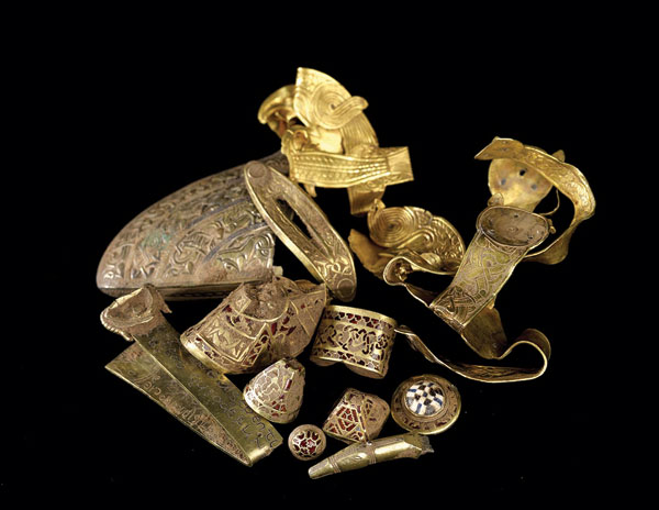今年7月,考古人員特里·赫伯特在英國(guó)中部的一個(gè)農(nóng)場(chǎng)中發(fā)現(xiàn)了迄今最大的、盎格魯撒克遜時(shí)期的寶藏,包含1500余件金、銀制品,其歷史可追溯至17世紀(jì)。