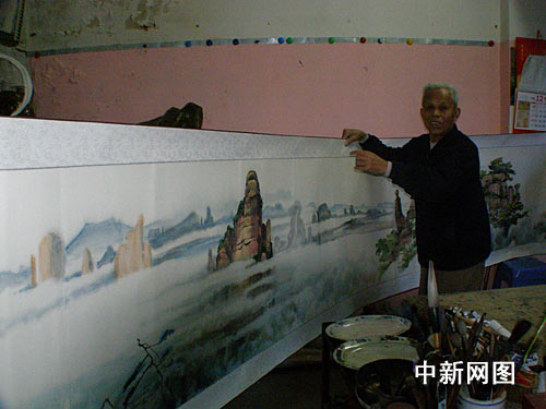 中新網韶關12月29日電 (馮昶 袁少洪)年近八旬的中國畫家譚飛彬老先生為支持丹霞申遺而創作的三十米國畫《丹霞山》,今日完成。