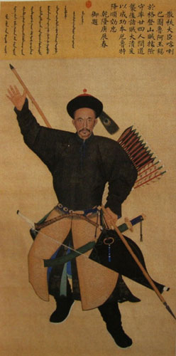 畫作的左上角注明滿文和漢文題贊:“頭等侍衛(wèi)固勇巴圖魯伊薩穆,援兵雖來,畫塹相望,孰騎而呼,為告無恙,維巴圖魯,偕往趣師,其沖賊隊(duì),如分水犀”——勇士的英名、事跡也和勇士的肖像一起懸掛朝堂,詔告天下,永存美譽(yù)了。
