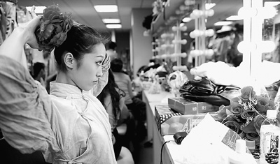 序幕里,周巖扮演的“和諧少女”在舞臺上空飛過,造型驚艷,一下子就調動起了觀眾的情緒。但在第一次吊威亞培訓時,她哭了。“為了安全,腰上要系得特別緊。”在天上吊著的時候沒有什么感覺,結果腳一著地,“就疼哭了”。