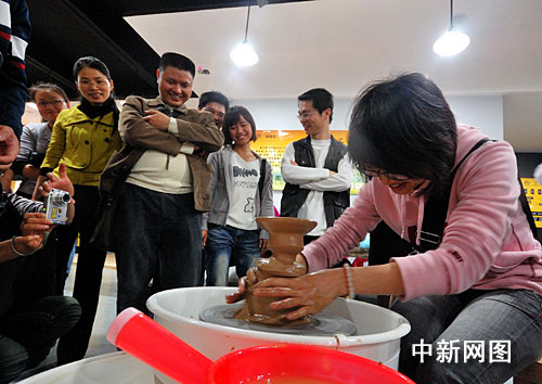 制作現(xiàn)場上,優(yōu)美動聽的古箏樂曲不停地繚繞盈耳,瓷藝家們或捏或雕,或刻或鏤,或推或接,各種傳統(tǒng)技法紛紛上陣,精彩紛呈。這行云流水般的手法、精妙細致的做工、別出心裁的設計,讓參觀者看得眼花繚亂,贊嘆不已,為之折服。人們忍不住上前摸一摸細膩的瓷泥,轉一轉工作盤,拿一拿精致的制作工具。前來參觀的顏小姐不禁挽起袖子也親身體驗了一回手拉坯。在轉盤的帶動下,顏小姐雙手輕拉瓷泥,那團柔軟的瓷泥仿佛有了靈性一般“舞蹈”起來,一會變成一個款嘴的大海碗,一會又變成一個細腰的小花瓶。舉著滿手的瓷泥,顏小姐開心地說:“太有意思了,讓我想起小時候玩泥巴的情景。”她還表示:“下次有空的時候,我一定還要再來玩手拉坯,DIY一件作品做紀念。”