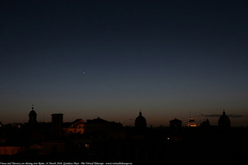 3月31日晚,在羅馬的天文學家Giancula Masi當夕陽西下后,朝西眺望,發現了金星和水星同時出現在天空的罕見天象。他趕緊抓拍下這美麗的景象。
