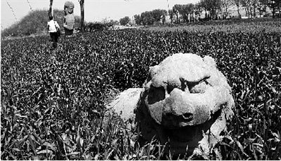 永昌陵石雕散布在麥田里周邊有十來個小化工廠,“一下雨常是酸雨”