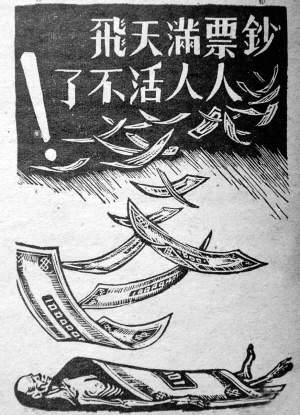 對于通貨膨脹,當年老百姓曾這樣描述:國民黨政府發行的法幣,1937年100元可買到兩頭牛,1938年變為一頭牛,1939年可買一頭豬,1941年能買到一袋面粉,1943年能買一只雞,1945年能買一個煤球,到了1948年,只能買到幾粒大米。