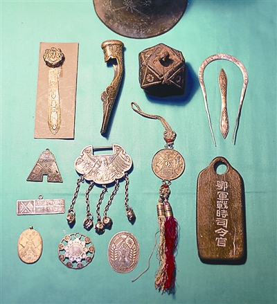 朱漢昌收藏的“鄂軍戰時司令官令牌”、鄂軍武昌起義紀念章、鄂軍政府證章等雙旗文物。 劉建林 攝