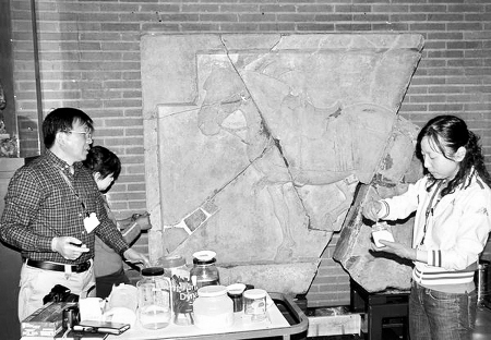 來自陜西唐大明宮遺址文物保護基金會的赴美代表和隨團記者以及美方專家,共同見證了這一時刻。據西安專家組組長楊文宗介紹:今天主要進行的是補全工作,補全是文物修復工作中比較重要的環節,在上一周及前期在國內大量實驗工作的基礎上,終于開始了補全工作的實施。前期試驗段主要包括修補材料的選擇、采用工藝的確定等工作,待實驗結束后,中美雙方專家就實施方案進行了最終的敲定。今天的補全工作首先是使用加固劑對斷面進行加固,其次是調制修補用的填補材料。今日開始,修補的部位主要為拳毛騧表面橫向出現的3條裂縫,約3.5米,颯露紫右下角、拳毛騧左下中部、左側面等幾處缺失做了填充修補。