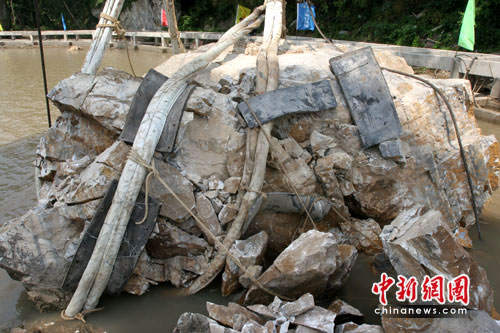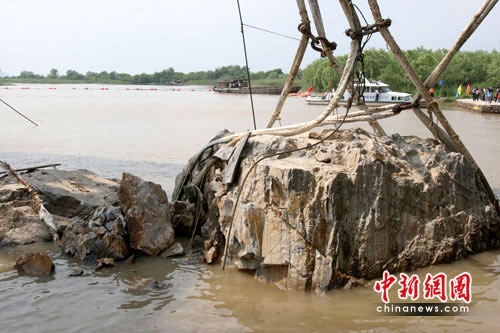 中新網(wǎng)鎮(zhèn)江6月4日電(趙國(guó)財(cái) 唐娟)4日下午,首塊《瘞鶴銘》摩崖石刻疑似殘石被巨型“勇士號(hào)”浮吊船吊起約半米后發(fā)生碎裂,首次起吊被迫終止。在打撈人員下水清理碎石后,傳來(lái)最新消息。《瘞鶴銘》打撈項(xiàng)目現(xiàn)場(chǎng)總指揮王雷介紹,碎裂的石頭不會(huì)對(duì)其他三塊預(yù)備打撈的石頭造成損壞。相較于首塊殘石,他更寄希望于壓在該石下面的殘石。他表示,爭(zhēng)取一周后展開第二次打撈。
