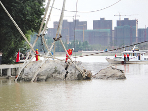 鎮(zhèn)江文廣新局副局長(zhǎng)孫小梅表示,在打撈預(yù)案中已有巨石破裂的預(yù)案,并且打撈方認(rèn)為這種可能性超過(guò)50%,因?yàn)榫奘菑慕股巾斏纤ぢ渲两械氖w早已受損;加上多年的風(fēng)化、江水長(zhǎng)期浸泡,使得石體出現(xiàn)質(zhì)變。打撈只不過(guò)將巨石的隱性傷痕變?yōu)轱@性。