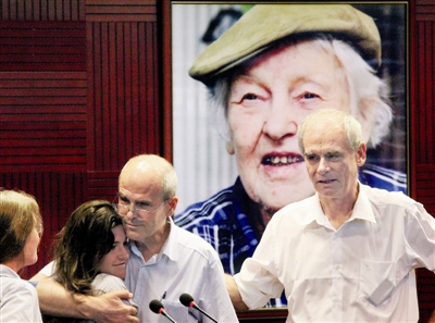 當北京外國語大學離休教授、90歲的老專家伊麗莎白來到現場后,寒春最小的外孫女走上前擁抱,一老一少相擁而泣。