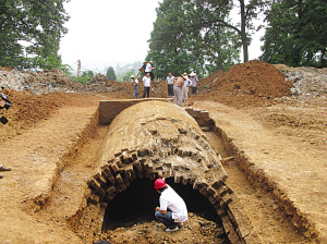 昨天下午,記者來到牛首山南麓的祖堂山弘覺寺旁,爬上山崗,眼前是個數百平方米的探坑,數十名考古人員正在清除浮土,探坑中央是一座保存完好的磚室古墓。古墓之所以被發現,主要是上周五,祖堂山福利院施工隊在為擴建項目到后山取土時,挖掘機一抓,抓出幾塊青磚,當時施工隊就報告了南京市文物局。