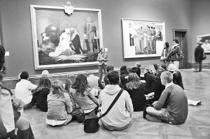 2007年11月底,記者在英國倫敦采訪時,在一個周三的晚上參觀了英國國家畫廊,在一個展廳正巧碰上一位老師在給十幾名中學(xué)生上課。學(xué)生在一幅名畫前席地而坐,老師在前面侃侃而談,解釋這幅畫作的歷史背景、色彩運用、光線處理。展廳的工作人員告訴記者,各個學(xué)校只要預(yù)約,都可以在規(guī)定的時間里在美術(shù)館給學(xué)生上課,而國家畫廊也有專門的解說員可以為中小學(xué)生免費義務(wù)講解。