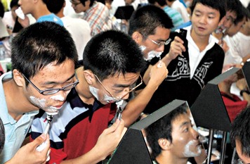 “不是這樣刮的,先要抹剃須泡!”盡管動作生疏,500名復旦大一男生還是一起舉起了剃須刀,剃去了殘留在他們臉上的稚嫩,完成了屬于90后的集體成人禮。昨天,復旦新生節上,一場別樣的成人禮在相輝堂舉行。