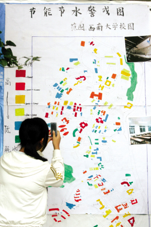 “我們寢室的用電量竟然排全宿舍第一。” 10月11日上午,這張“校園節能地圖”出現在西南大學廣場的展板上,吸引了不少同學的眼球。校內的教學樓、宿舍和道路的用水量和用電量,都以鮮艷的顏色標注在地圖上,教學樓則成為用電量最大的區域。