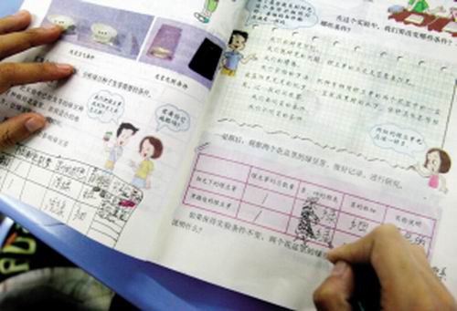 參與調(diào)查的同學(xué)韓迪聰介紹說,調(diào)查發(fā)現(xiàn)同學(xué)們?cè)谘h(huán)使用教科書時(shí),因?yàn)椴荒茉谏厦鎸懽痔羁樟耍托枰獪?zhǔn)備一個(gè)本子,抄寫教科書上需要填寫的內(nèi)容。比如說《科學(xué)》,里面就有一些實(shí)驗(yàn)報(bào)告,同學(xué)們或者把報(bào)告填寫部分抄下來,或者是自己復(fù)印,要不就是只聽課,不做題了。
