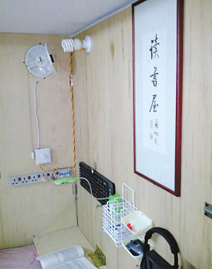 從論壇發(fā)布的照片上可以看到,三張木板及花色窗簾構(gòu)造了一個豐富的私人空間(圖一)。內(nèi)有照明、電腦及空氣循環(huán)設(shè)備,可伸縮的電腦屏幕和可隨時收合的寫字臺,鍵盤、鼠標(biāo)和耳機(jī)掛在墻上(圖二),使用的時候只要旋動一個旋鈕,東西就可以拿下來在任何地點(diǎn)使用。這個狹小的空間內(nèi)還有三層木架,可放生活用品(圖三)。最吸引人注目的是該男生還在床頭掛了一幅墨寶——“讀書屋”。給人的總體感覺是,這是一個富有創(chuàng)意又勤奮好學(xué)的學(xué)生。