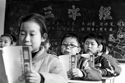 小學(xué)部教務(wù)主任翟振紅介紹,去年9月起,學(xué)校開設(shè)了校本課程《中華情——經(jīng)典誦讀》。6本國學(xué)經(jīng)典包括《三字經(jīng)》、《老子》、《弟子規(guī)》、《論語》、《大學(xué)》、《中庸》,共計(jì)3萬字,由學(xué)校出資復(fù)印成材料發(fā)給學(xué)生。