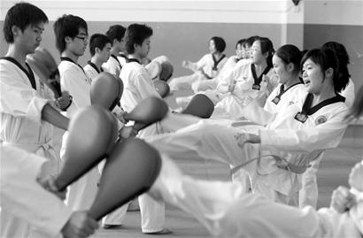 “嚯!哈!……”大學(xué)生會(huì)員們隨著口令,整齊劃一地踢腿。在一片白色的跆拳道服中,活躍的女生身影尤其顯眼,踢腿齊吼時(shí),音量雖趕不上男生,氣勢卻不輸給他們。跆拳道俱樂部學(xué)生負(fù)責(zé)人楊城介紹,在400多人的注冊(cè)會(huì)員中,女生人數(shù)比男生還要多。