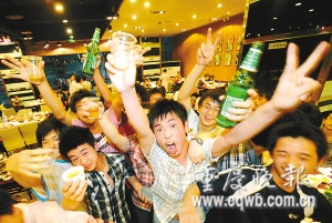 昨下午6點剛過,主城各區(qū)繁華路段,處處可見考生們聚會歡慶場面。