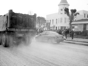 顧北東路是一條新建馬路,寬敞平坦,但一過富聯路,往東到顧村中心幼兒園門口就中止了,成了一條斷頭路,盡頭就是這個大型車停車場的唯一“入口”。每天,土方車、集卡、垃圾車來來往往川流不息,車輪帶出的泥土將顧北東路弄得到處是泥。車輛一過,塵土飛揚,如刮沙塵暴;雨天,水泥路成了泥漿路,人們稍不留神就會摔跤。