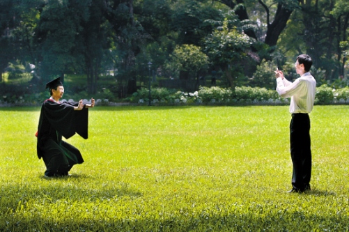 畢業(yè)生的節(jié)日上,穿上學(xué)士服一本正經(jīng)地拍好畢業(yè)照之余,他們還用各式各樣活潑的方式慶祝屬于自己的成人禮。鬼馬可愛(ài),這是昨天記者在中山大學(xué)發(fā)現(xiàn)的理工學(xué)院畢業(yè)生嚴(yán)肅形象以外的另一面。炎熱的天氣難擋他們放飛的心情,在當(dāng)前嚴(yán)峻的就業(yè)形勢(shì)下,這種樂(lè)觀積極的心態(tài)顯得尤為重要。 本報(bào)記者 何奔 攝影報(bào)道
