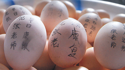 同學們送給老師的雞蛋都寫上了祝福的話語