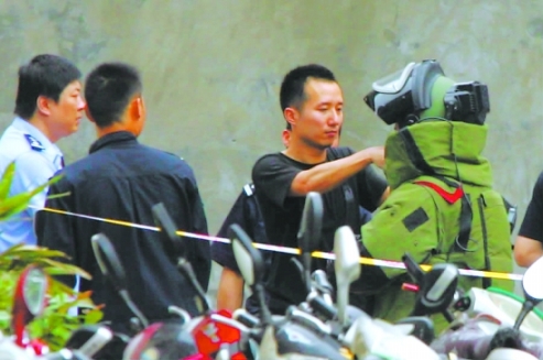 記者在通盛嘉苑斜對面的中北西子花園紫云苑A座9樓,清晰觀察到了排爆情況。警方先后排出排彈機器人、搜爆犬和拆彈專家,接近“炸彈”。下午3點58分,記者發現,民警經過幾輪偵察后,似乎放松了許多,上前將黑袋子取走。