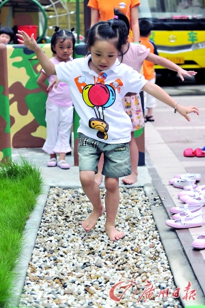 本報訊 (記者陳昕宇)赤足踩碎石、晨練時需要過“梅花樁”、俯身貼地穿越水管、輕舒猿臂通過懸掛在半空中的吊臂、寒冬冷水浴……上述情景不是出現在特種部隊的訓練營中,而是佛山一所位于高檔住宅小區的幼兒園專為幼兒所開設的生存磨難教育課程。 據介紹,生存磨難課程最早起源于日本教育界,目的為磨煉學生的意志。昨日,記者來到該所幼兒園,對生存磨難教育的部分項目進行了體驗。