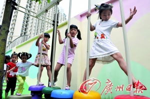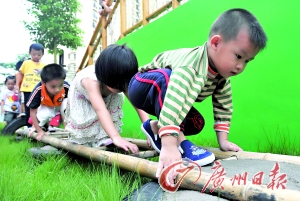 記者在現場見到,與其他幼兒園不同的是,剛開辦的禪城區天湖酈都幼兒園1700平方米的戶外活動場地上,布滿了“梅花樁”、“吊臂橫桿”、“高空爬網”、“水泥管”、“迷宮”、“碎石路”等各種各樣的設施,儼然一個小型“戶外軍事拓展基地”。